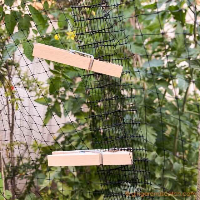 I used wooden clothes pins to close up the gaps at the ends which also allowed easy access to the netted part of the garden for harvesting. I’ve found that plastic clothes pins fall apart and disintegrate in the hot desert sun.
