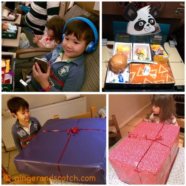 First order of business after landing in Edinburgh – belated birthday presents from the grandparents to Wee Scotch and Li’L Ginger. Their presents were in boxes that seemed bigger than their little bodies!